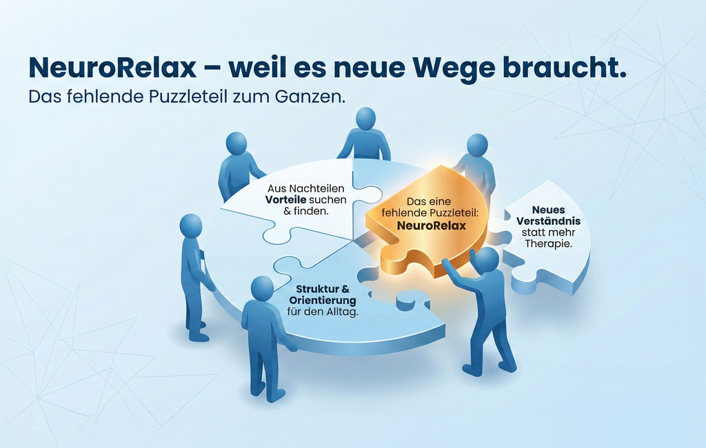 Auf dieser Seite besteht die Möglichkeit, sich einen verständlichen, kompakten und übersichtlichen Einblick in die wichtigsten Inhalte von NeuroRelax zu verschaffen und erste Puzzleteile als Unterstützung mit Hilfe von NeuroRelax kennenzulernen.